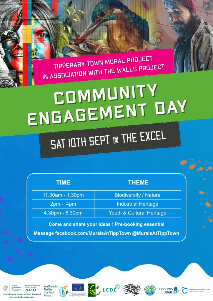 The programme kicks off next weekend with some workshops in Tipperary Excel on Saturday. These workshops will help the artists develop the content and sketches for each wall. There are some limited places available and pre booking is essential, please message the Tipperary Town Revitalisation Social Media pages to book a place.