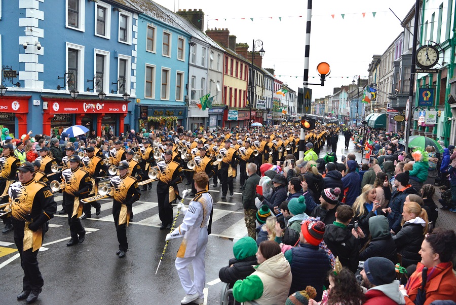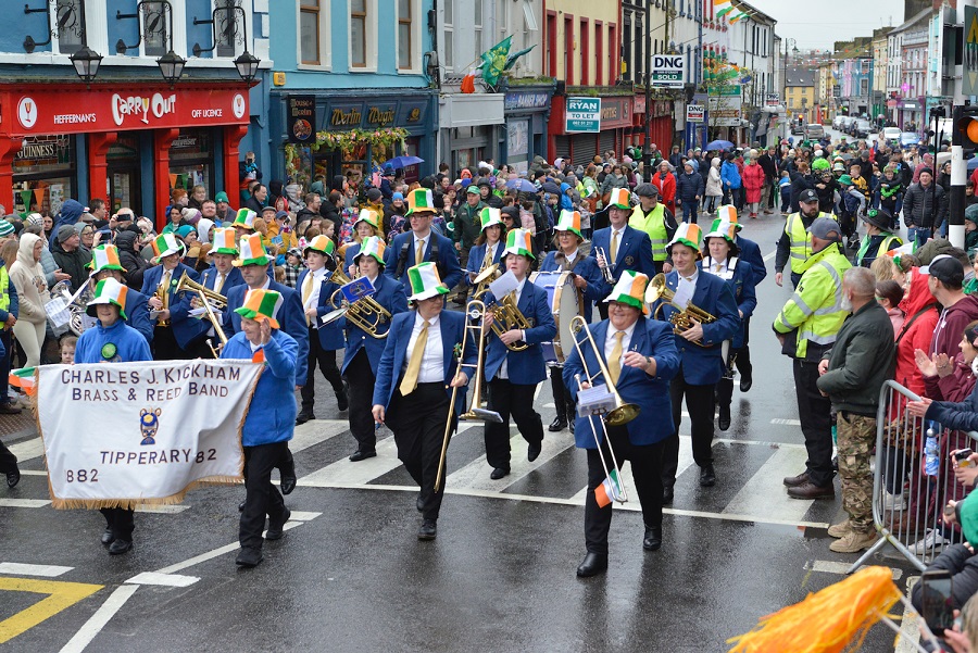 Rain did not deter a jubilant crown at the recent Tipperary Town St. Patrick’s Day Parade held on Saturday, March 16th. The event was held a day earlier than usual to facilitate the visit of the University of Missouri ‘Marching Mizzou’ who thrilled the huge crowd with an exhilarating closing performance on Main Street.